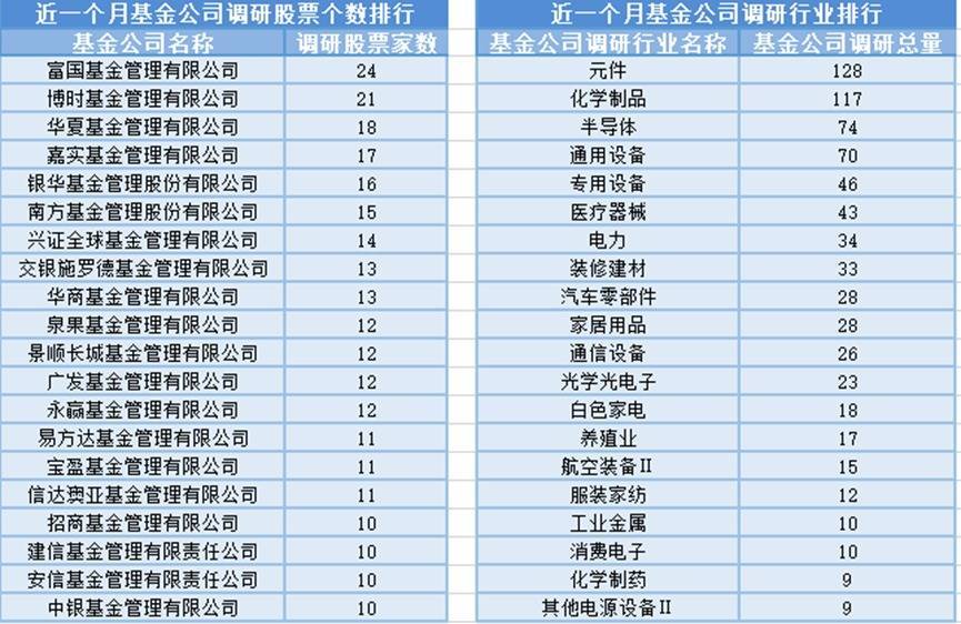 近一个月(2月10日-3月12日),富国基金参与公司调研的数目最多,共调研24家上市公司,此外调研较为活跃的还有博时基金、中原基金和嘉实基金,分辩调研21家、18家、17家上市公司;从调研行业上来看,基金公司对元件行业的上市公司调研次数最多,共有128次,其次是化学成品行业,基金公司调研了117次。